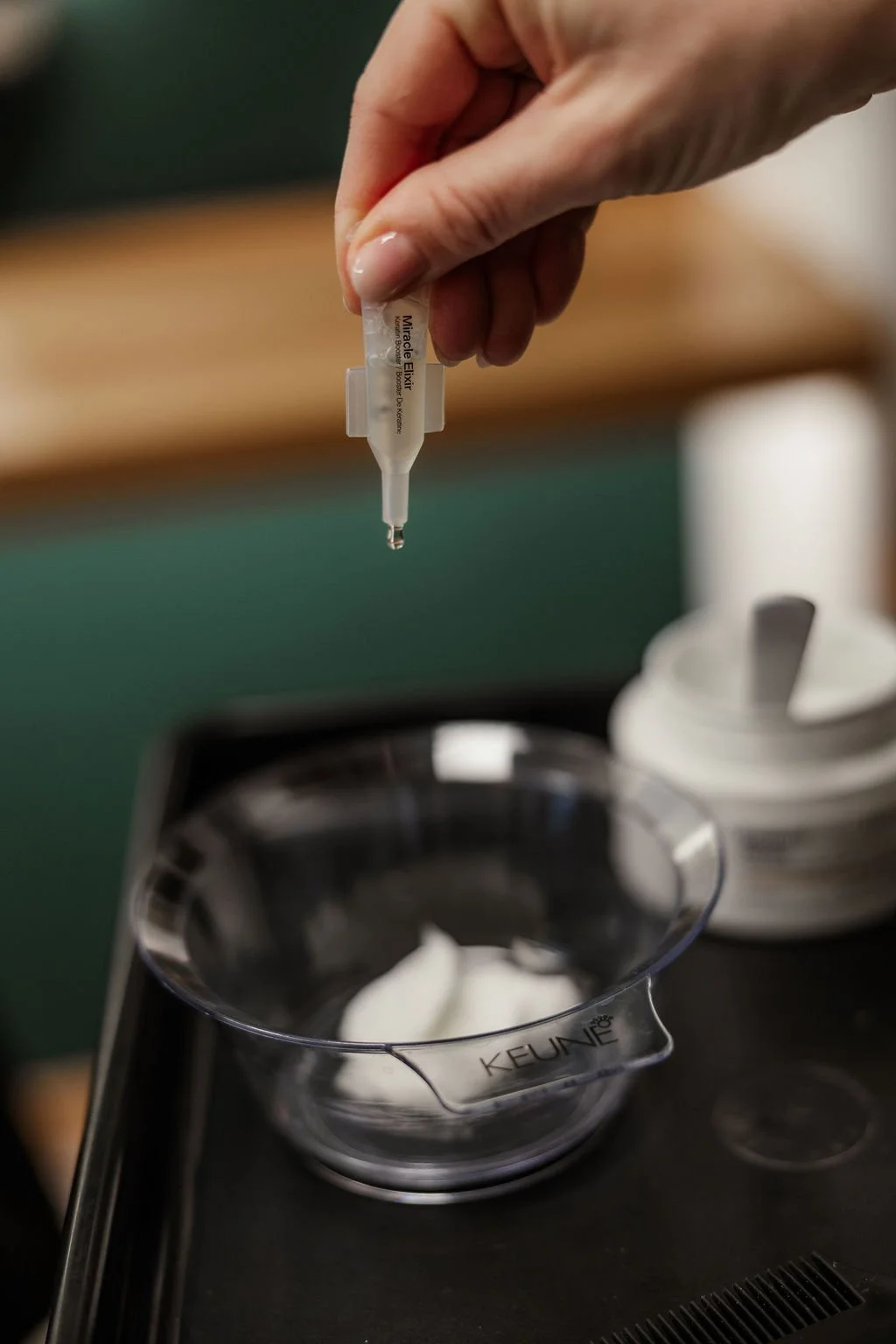 Gewelltes, lockiges und krauses Haar wird mit der Confident Curl Routine definiert und intensiv mit Feuchtigkeit versorgt. Die Curl-Produkte lassen sich mit KEUNE Care individuell kombinieren, um das volle Potenzial von strukturiertem Haar zu entfalten. Miracle Elixir mit pflanzenbasiertem Keratin repariert strapaziertes Haar von innen und stärkt geschwächte Haarpartien. Für maximalen Glanz wird es mit der Confident Curl Curl Enhancing Mask oder mit Velvet Smooth Anti-Frizz Mask kombiniert und mit einer entspannenden 10-minütigen Kopfmassage eingearbeitet. Anschliessend wirkt die Pflege 20 Minuten mit Wärme ein. Ein hochwertiger Keratin-Spray zur Reaktivierung der Pflege zu Hause ist im Behandlungspreis inbegriffen.